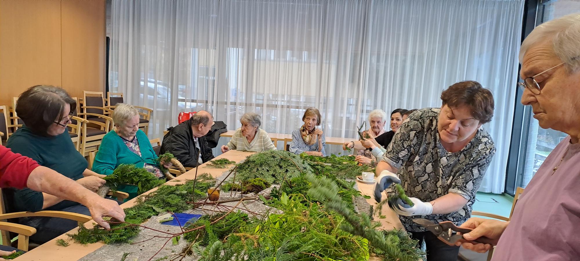 Am Samstag, dem 25. November 2023 haben die Heimhelfer:innen mit unseren Bewohnern gemeinsam die Adventkränze für unser Haus gebunden. Im Vorfeld haben wir aus Häckeldeckchen Körbchen geformt und mit diesen dann unsere Kränze dekoriert. Das gemeinsame „Kranzen“ weckte großes Interesse und es fanden sich viele helfende Hände. Auch der Duft des frischen Tannenreisigs, der sich im Haus verströmt, weckte großes Wohlbefinden …