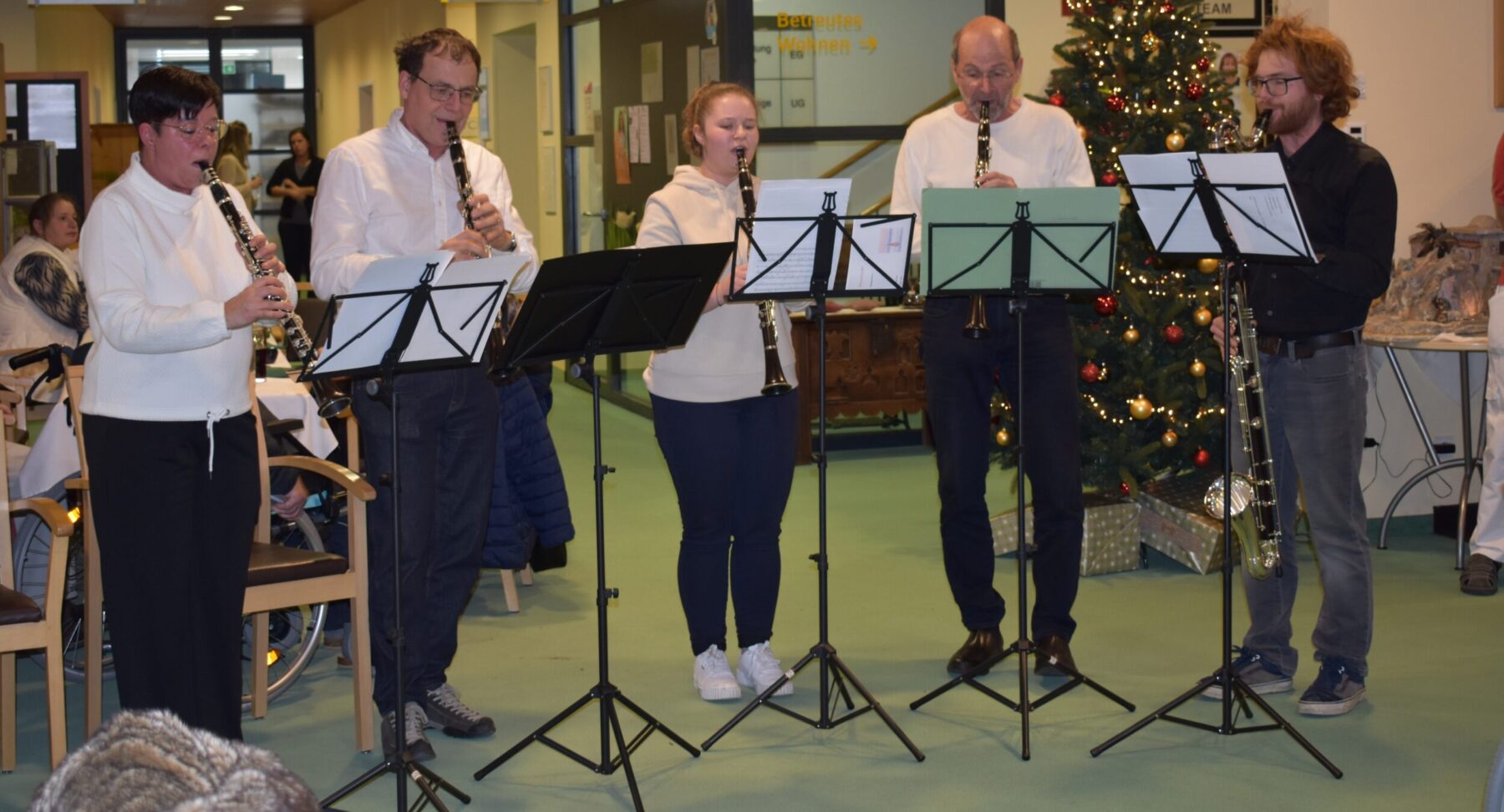 Musikalisch wurde die Feier stimmungsvoll begleitet: Die Gruppe „Spätzünder“ präsentierte klassische Weihnachtslieder und lud zum Mitsingen ein. Für besonders berührende Augenblicke sorgte die Klarinettengruppe unter der Leitung von Gabi Bereuter. Der Kinderchor „Leandospatzo“ sorgte für einen ganz besonderen Moment: Beim gemeinsamen Singen und Musizieren der Kinder mit unseren Bewohner:innen entstand ein herzliches Miteinander, das im Vorfeld unter der engagierten Leitung von Ramona Dür intensiv geprobt wurde. Diese musikalischen Begegnungen schufen eine heitere und lebendige Atmosphäre, die viele zum Austausch und Verweilen einlud.