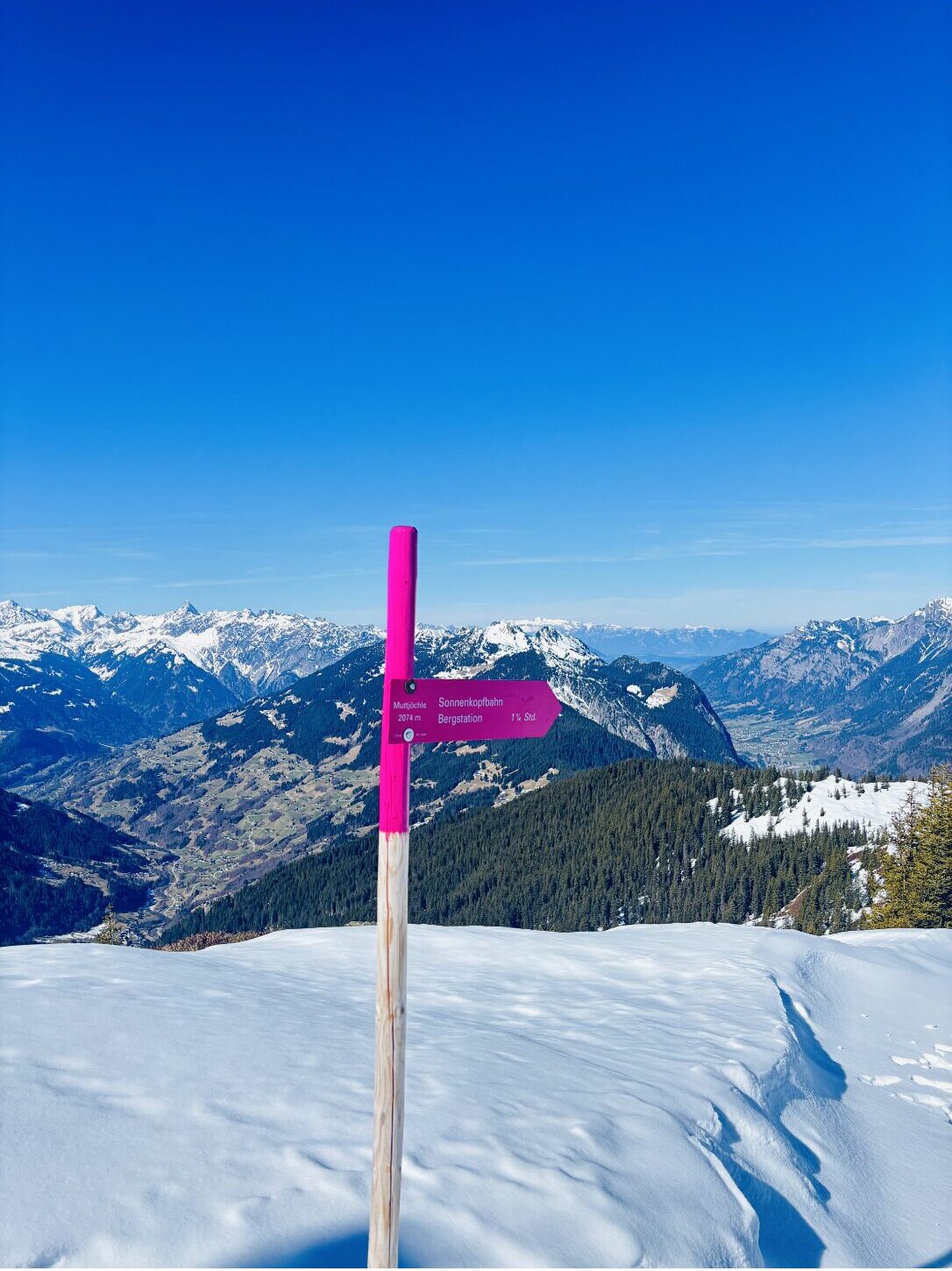 Der Weg zum Muttjöchle führt durch eine beeindruckende Winterkulisse. Schon nach den ersten Schritten blieb der Alltagsstress spürbar im Tal zurück. Durch das gleichmäßige Gehen durch die verschneite Landschaft, die Ruhe der winterlichen Bergwelt und die weiten Ausblicke konnten wir unsere Seelen so richtig baumeln lassen und Kraft tanken.