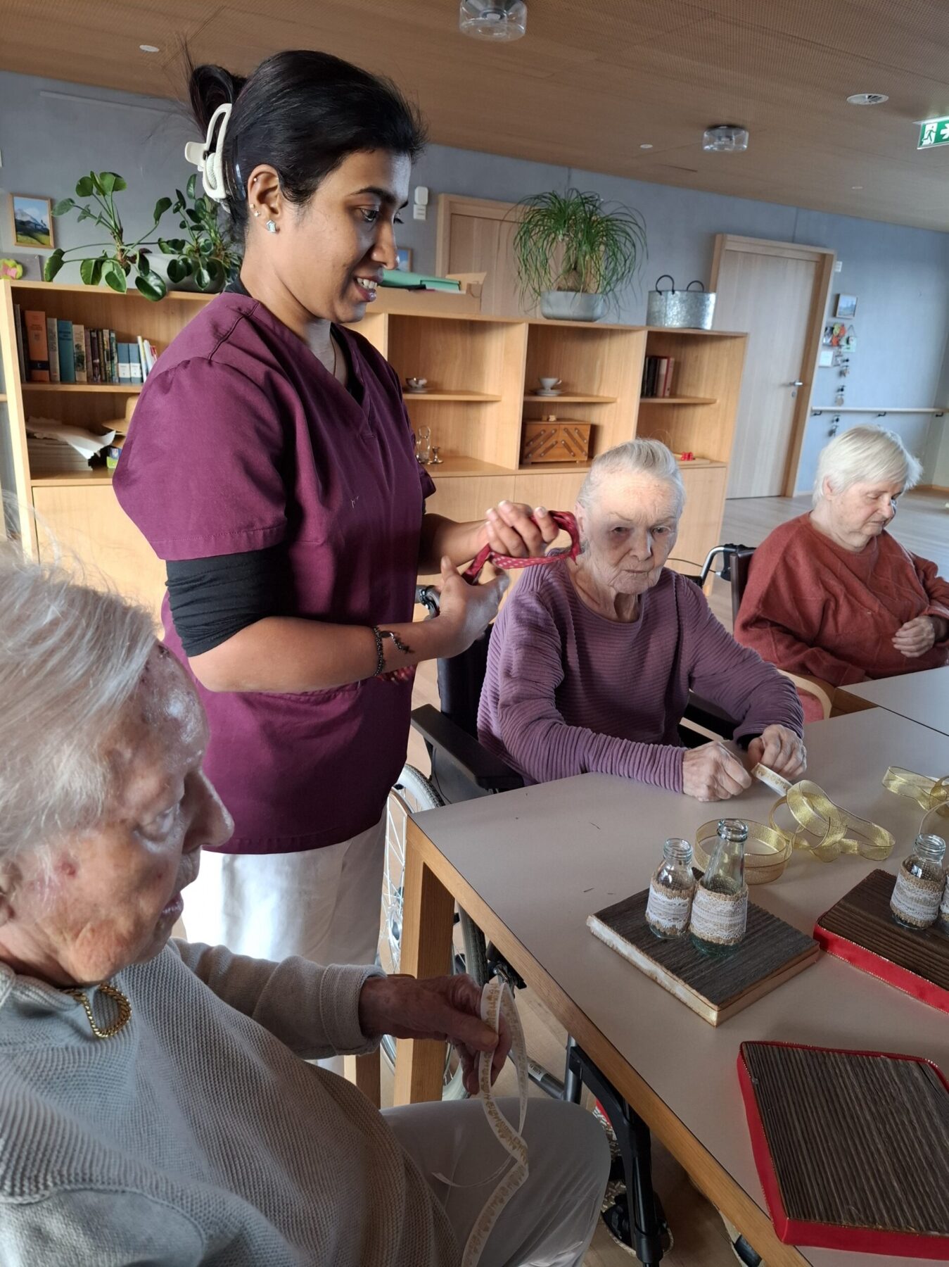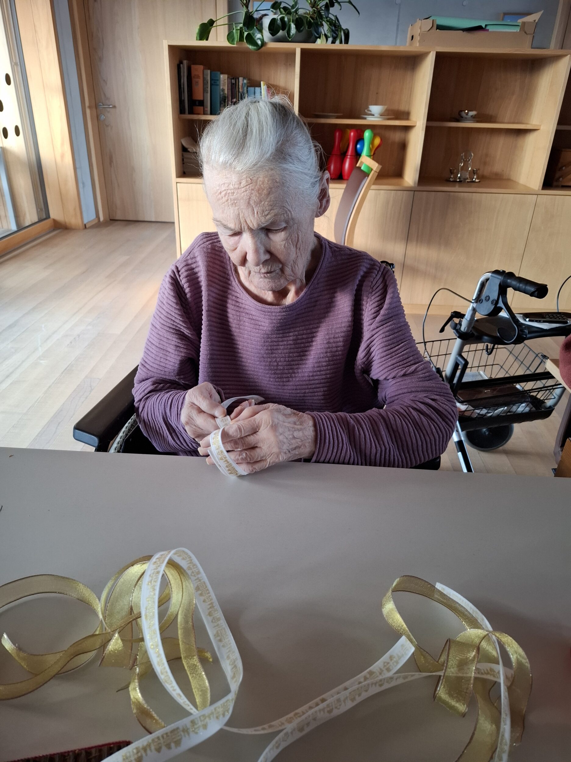 Am Samstag wurde gemeinsam mit den Bewohner:innen die Weihnachtsdekoration gestaltet. Die Bewohner:innen hatten die Möglichkeit, aus einer Vielzahl von Dekorationsmaterialien zu wählen, darunter bunte Kugeln, verschiedene Bänder und Naturmaterialien.