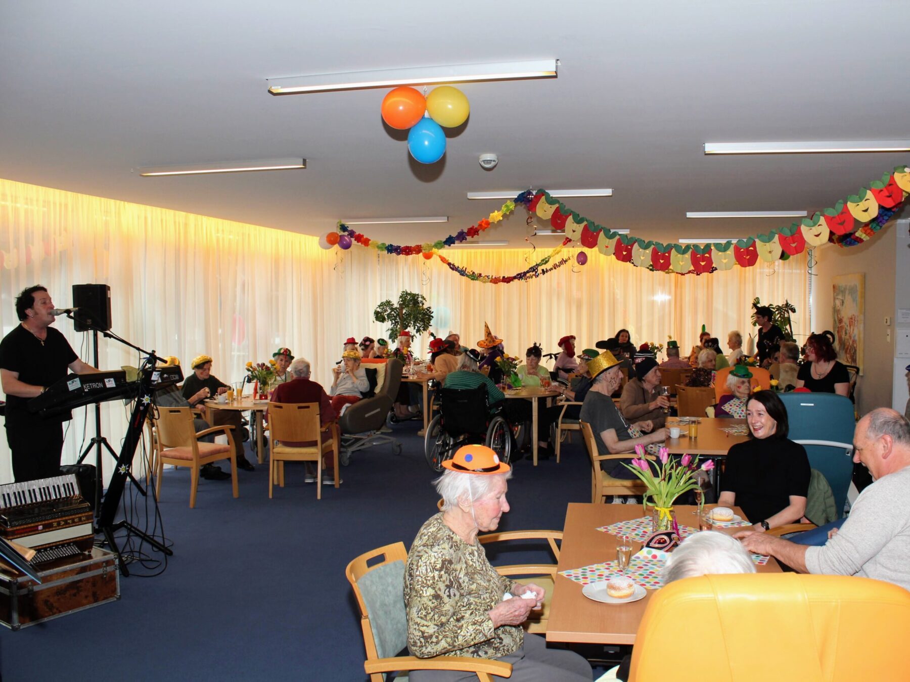 Mit schwungvollen Melodien zum Mitsingen, Mitklatschen und Schunkeln sorgte Armin Schwarzmann für beste Stimmung. Natürlich durfte auch eine fröhliche Polonaise nicht fehlen. Gemeinsam zog man lachend durch den festlich geschmückten Raum.