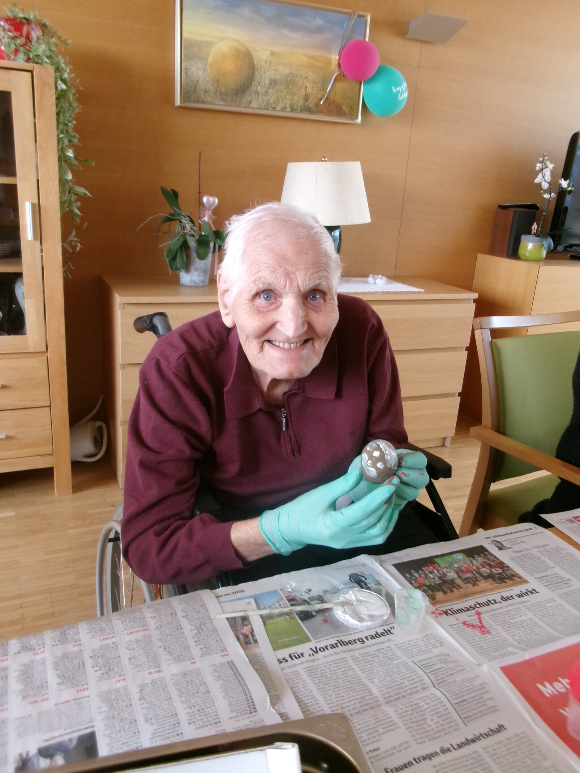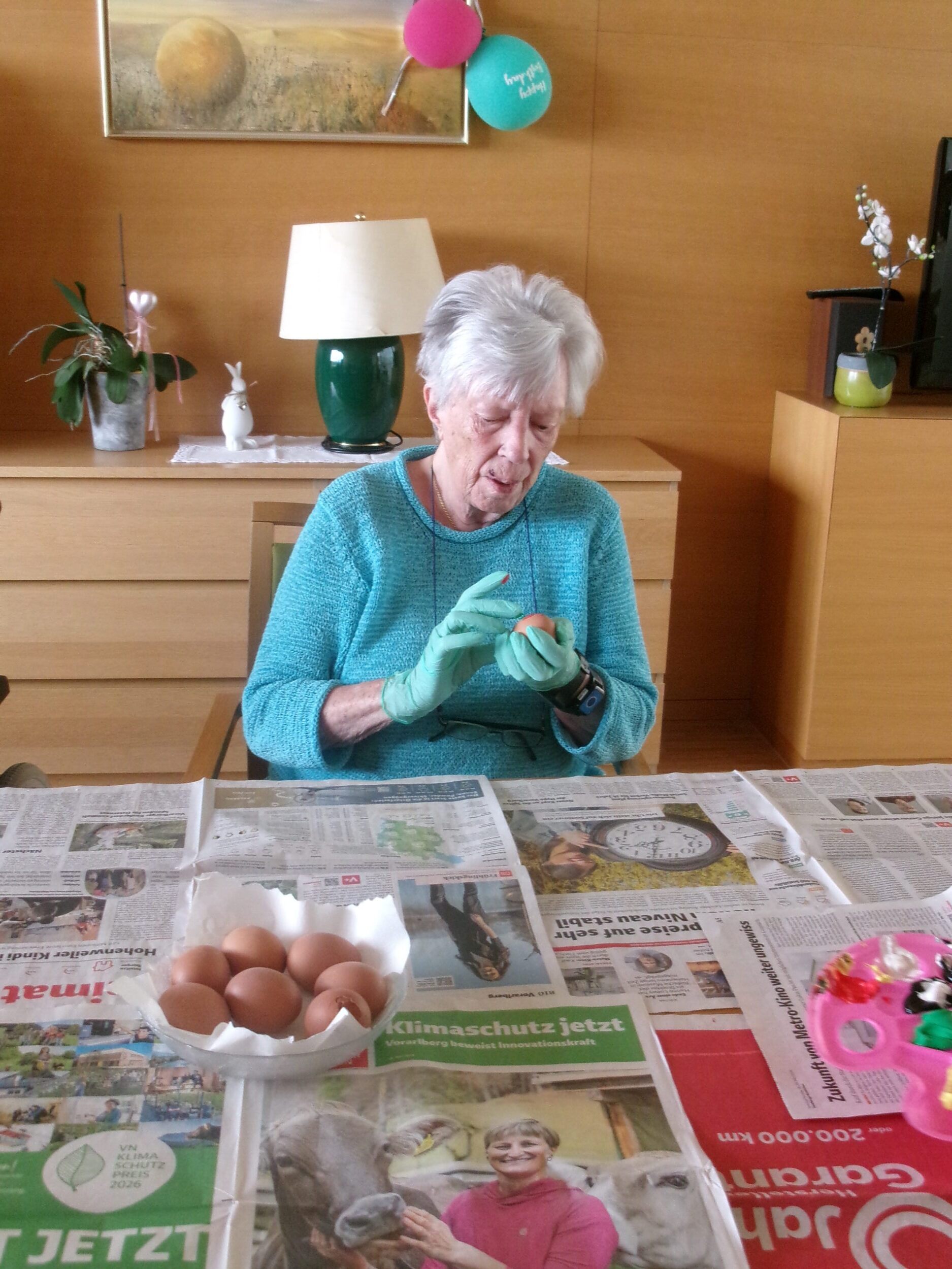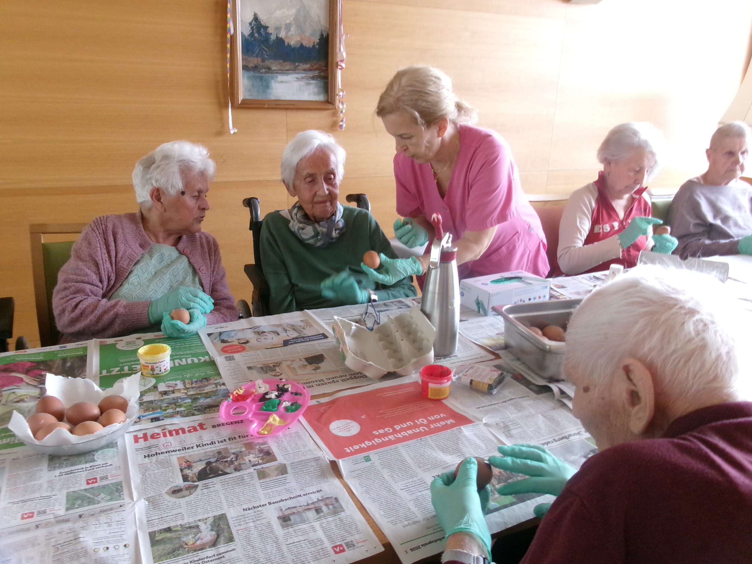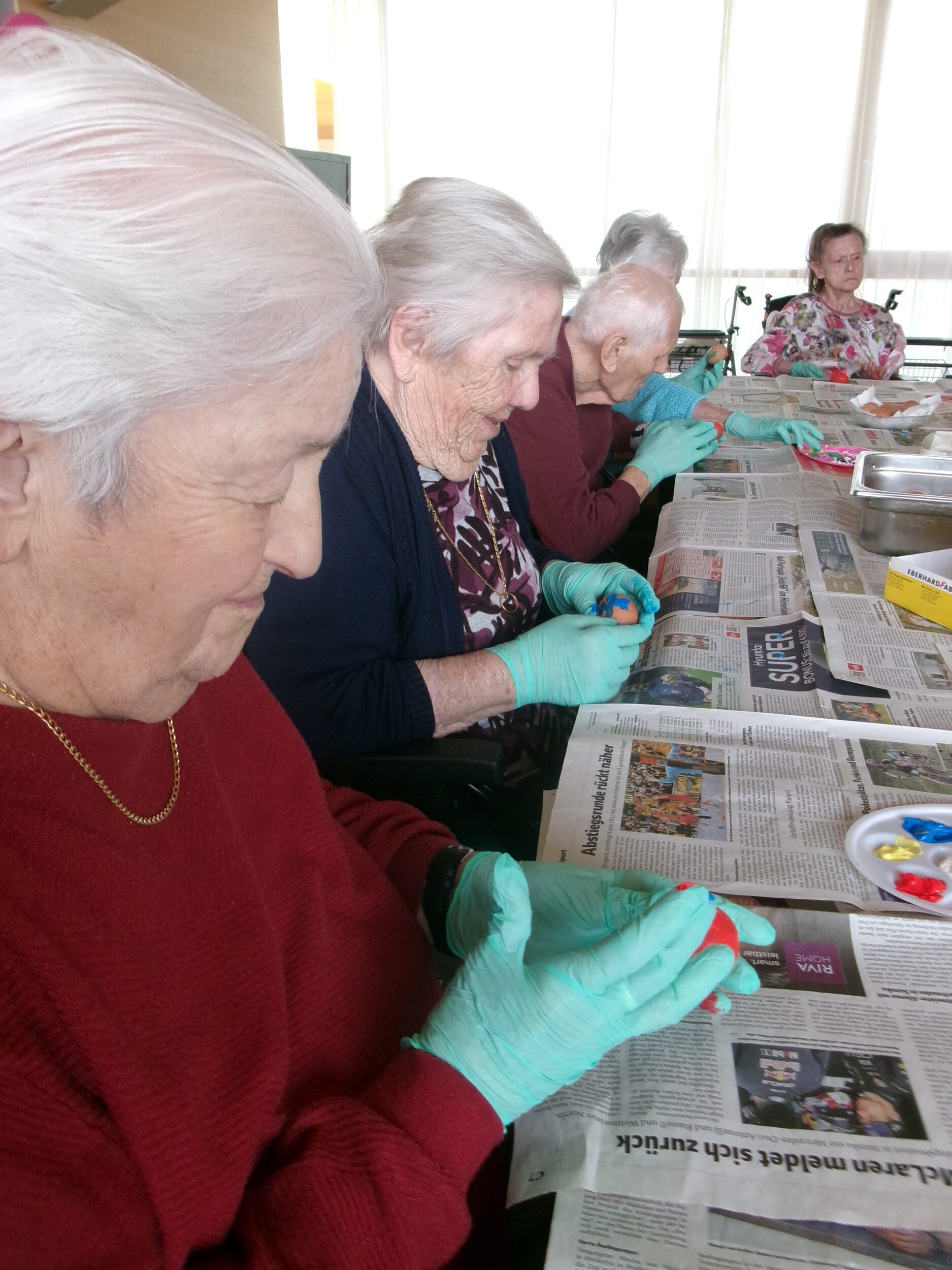 Im BENEVIT SZ Weidach herrschte rund um das Eierfärben eine fröhliche Atmosphäre. Die Bewohner/innen waren mit Eifer bei der Sache und tauchten begeistert in die kreative Beschäftigung ein. Beim gemeinsamen Tun kamen Erinnerungen an schöne Zeiten aus Jugend und Schulzeit auf, die lachend am Tisch geteilt wurden. Gummihandschuhe schützten die Hände, und los ging’s: Farben tanzten in abwechslungsreichen Muster über die Eier, flammende Gelb-, Blau- und Rottöne mischten sich zu fröhlichen Kreationen. Die kunstvoll bemalten Eier fanden ihren Platz im Korb, bunt und vielfältig wie die Geschichten, die sie begleiteten.