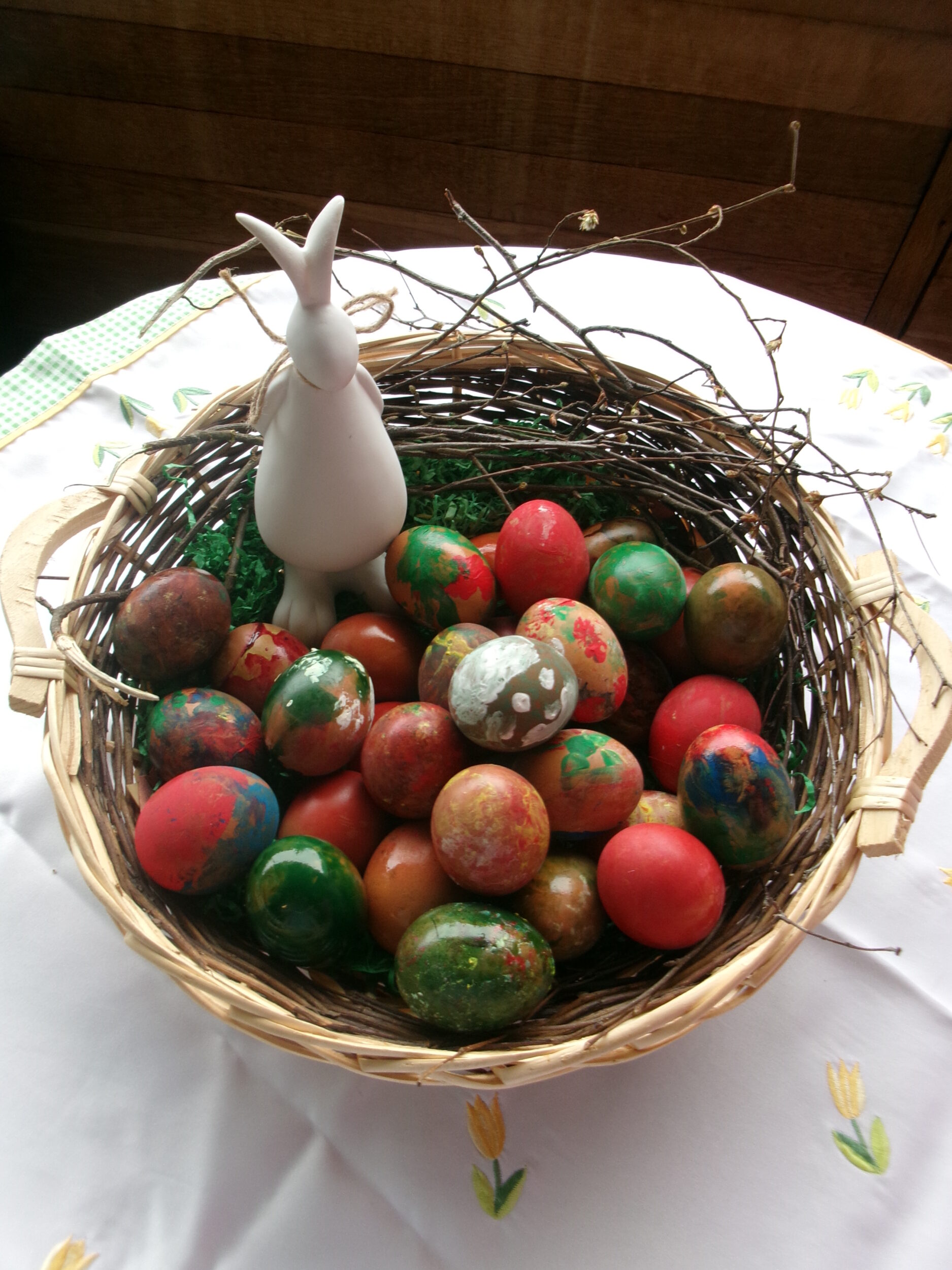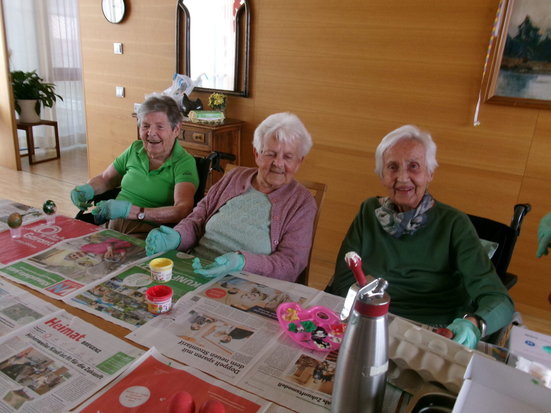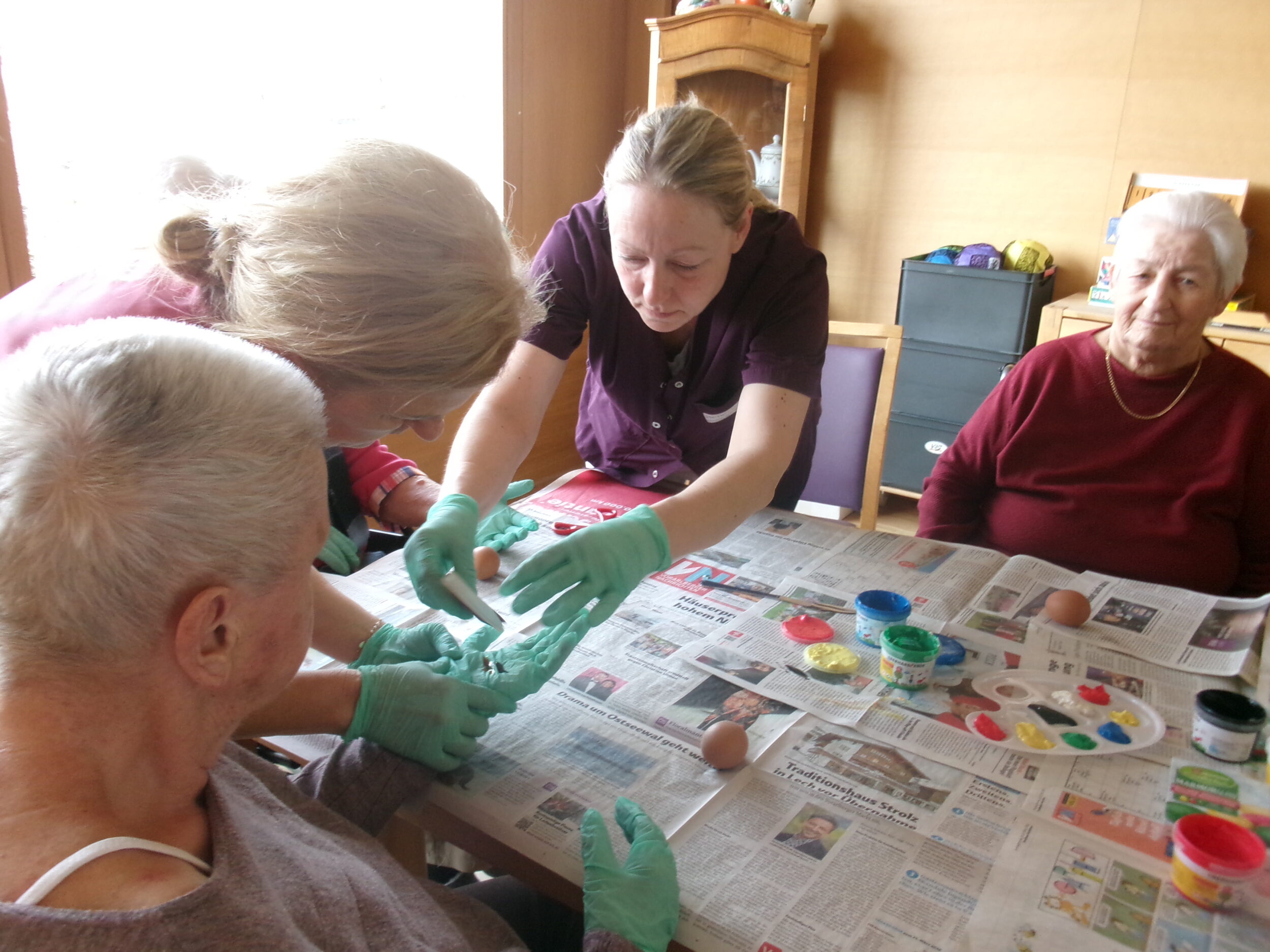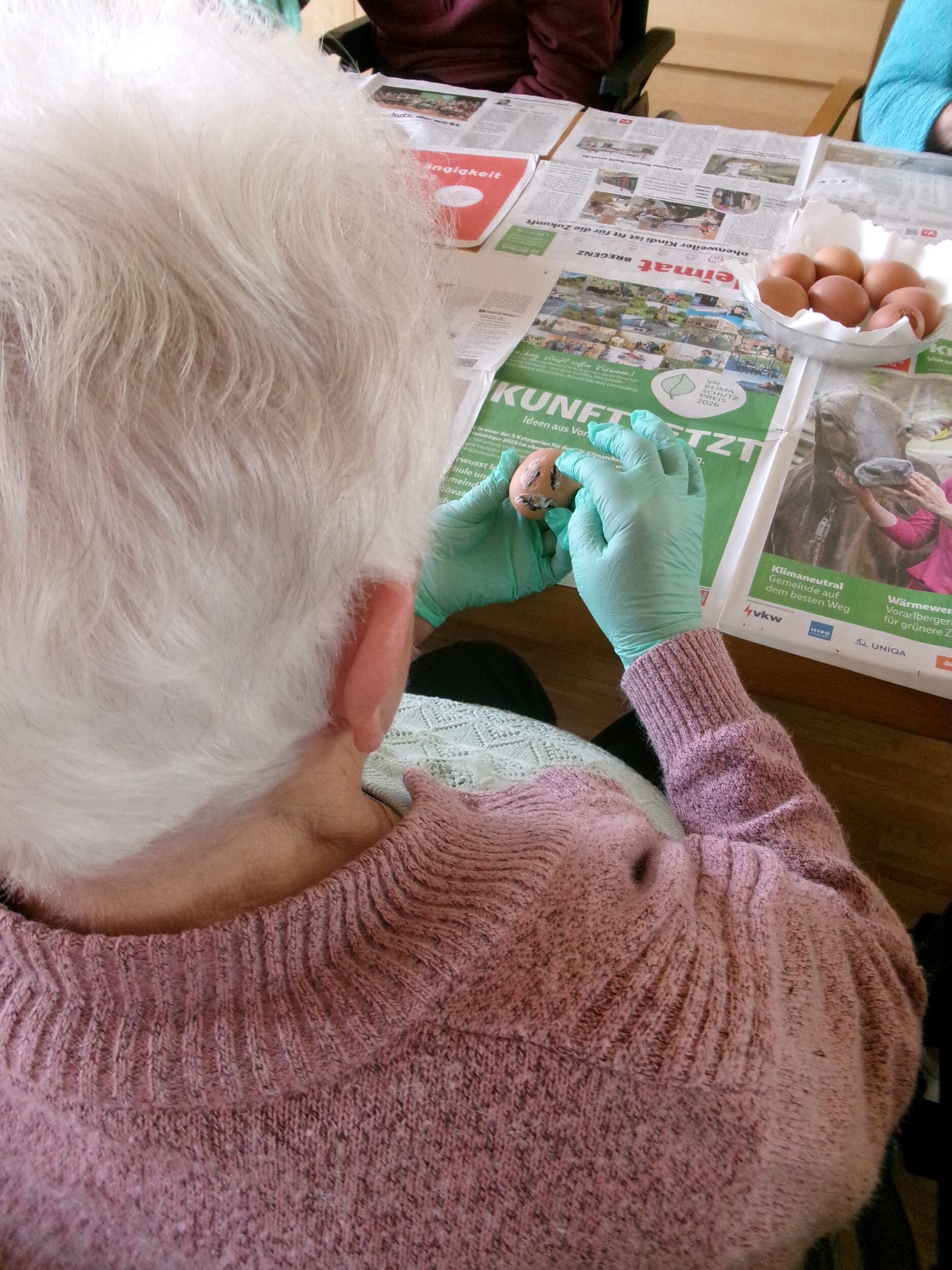 Im BENEVIT SZ Weidach herrschte rund um das Eierfärben eine fröhliche Atmosphäre. Die Bewohner/innen waren mit Eifer bei der Sache und tauchten begeistert in die kreative Beschäftigung ein. Beim gemeinsamen Tun kamen Erinnerungen an schöne Zeiten aus Jugend und Schulzeit auf, die lachend am Tisch geteilt wurden. Gummihandschuhe schützten die Hände, und los ging’s: Farben tanzten in abwechslungsreichen Muster über die Eier, flammende Gelb-, Blau- und Rottöne mischten sich zu fröhlichen Kreationen. Die kunstvoll bemalten Eier fanden ihren Platz im Korb, bunt und vielfältig wie die Geschichten, die sie begleiteten.