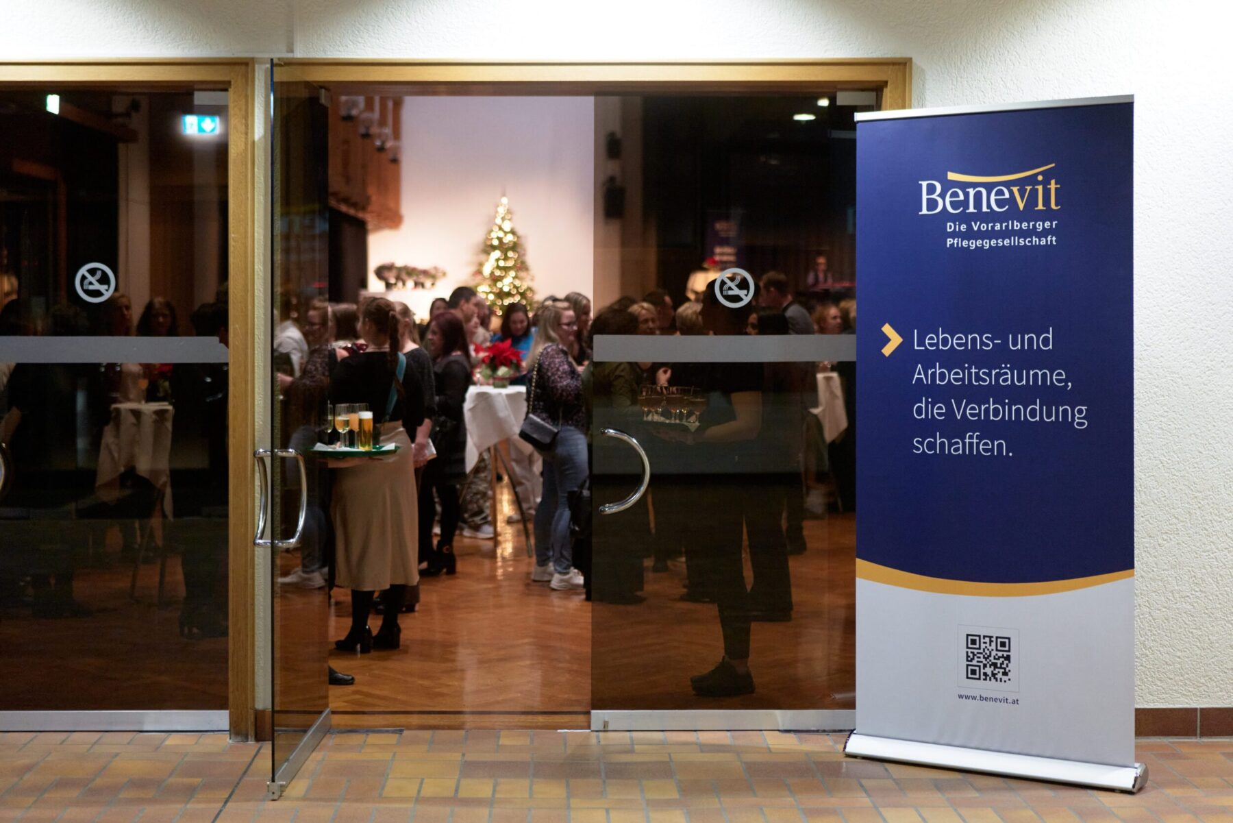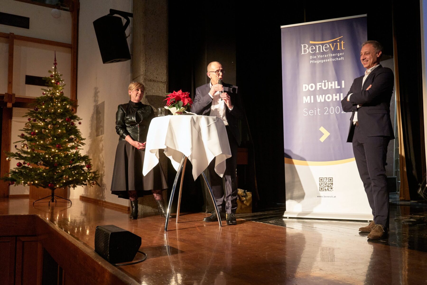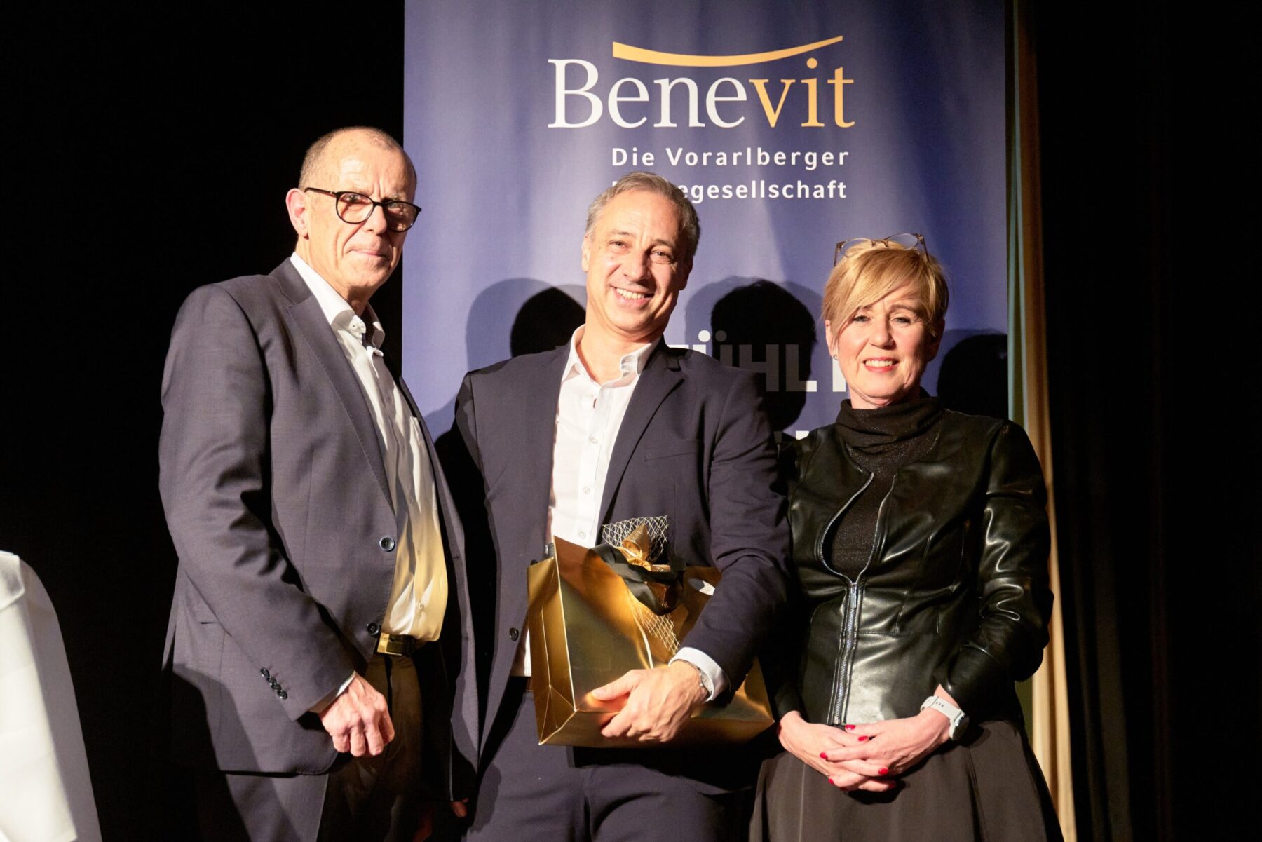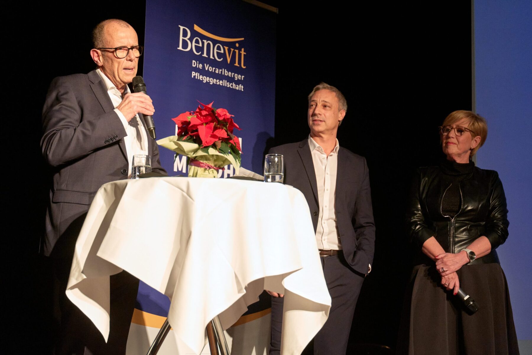 Zu Beginn richtete die BENEVIT-Geschäftsführung einige Begrüßungsworte an die Anwesenden. Geschäftsführerin Carmen Helbok-Föger und Geschäftsführer Thomas Scharwitzl, der zugleich auch als Jubilar auf der Bühne stand, berichteten kurz über aktuelle Entwicklungen bei BENEVIT. Bestärkende Worte kamen anschließend vom Präsidenten des Vorarlberger Gemeindeverbands und neuen BENEVIT-Aufsichtsratsvorsitzenden Walter Gohm, bevor es zum Vorspeisenbuffet ging – oder alternativ zur Photobox, die neben dem Bühnenprogramm wohl der größte Anziehungspunkt des Abends war.