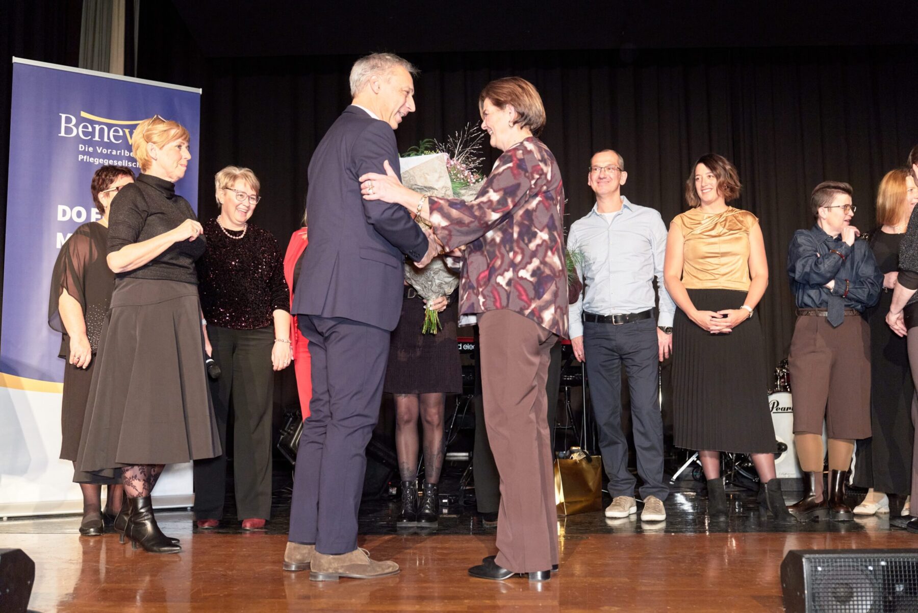 Im Anschluss wurden die Jubilare geehrt. Auf beeindruckende 35 Jahre bei BENEVIT blickt Frau Söngül Öztürk aus dem BENEVIT Sozialzentrum Alberschwende zurück. Zudem feierten gleich drei Mitarbeitende aus dem BENEVIT Sozialzentrum Weidach in Bregenz ihr 25-jähriges Jubiläum: Frau Colic Sanja, Frau Ilic-Milojevic Lalica und Elmar Chiesola, Betriebsratsvorsitzender, der es sich nicht nehmen ließ, sich auch im Namen der Mitarbeitenden bei der Geschäftsführung zu bedanken – verbunden mit einem besonderen Weingeschenk aus seinem eigenen Keller.