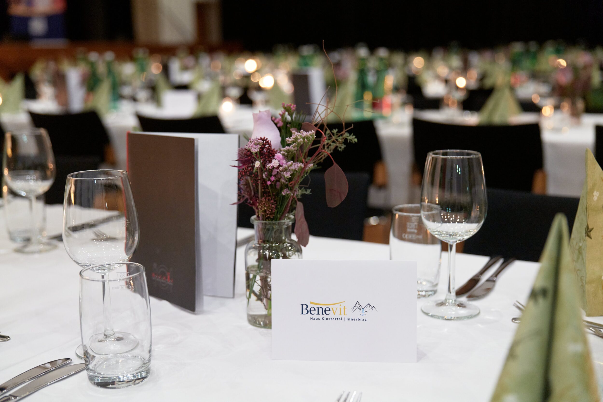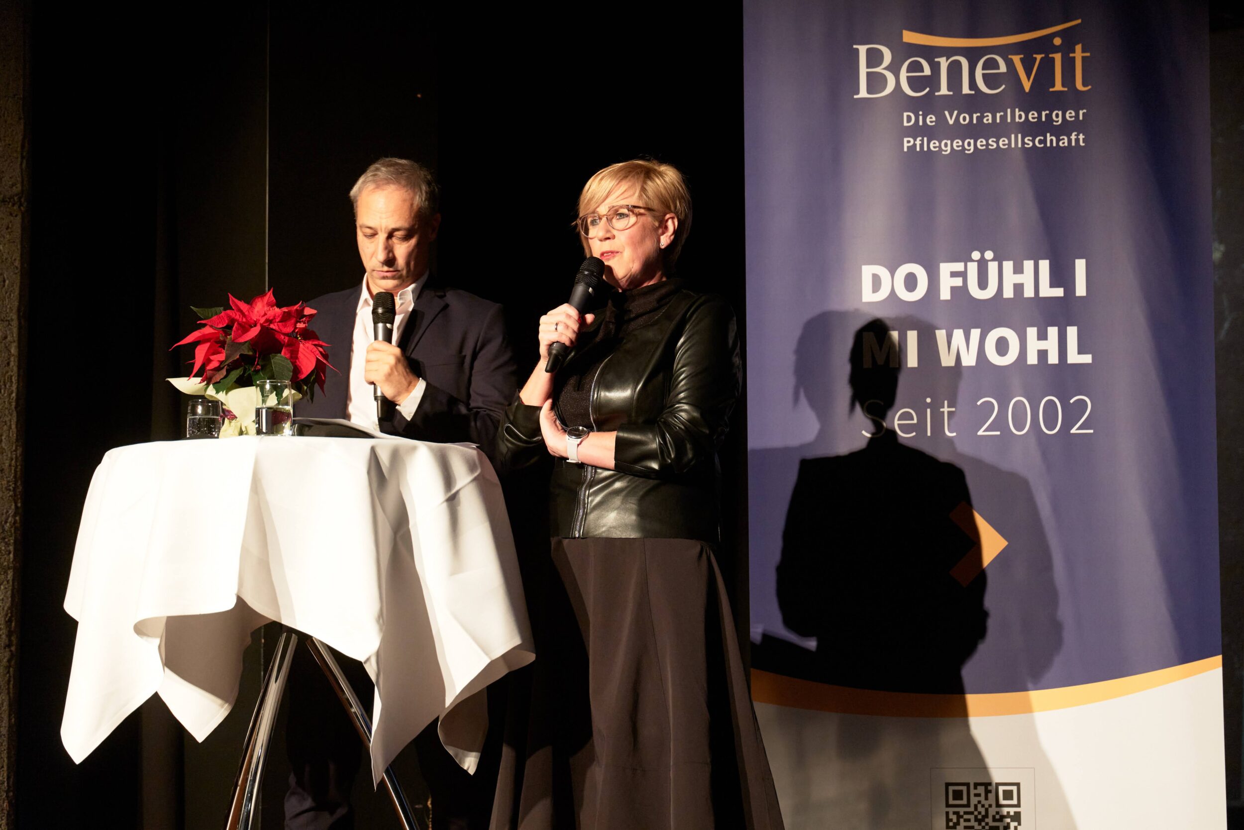 Zu Beginn richtete die BENEVIT-Geschäftsführung einige Begrüßungsworte an die Anwesenden. Geschäftsführerin Carmen Helbok-Föger und Geschäftsführer Thomas Scharwitzl, der zugleich auch als Jubilar auf der Bühne stand, berichteten kurz über aktuelle Entwicklungen bei BENEVIT. Bestärkende Worte kamen anschließend vom Präsidenten des Vorarlberger Gemeindeverbands und neuen BENEVIT-Aufsichtsratsvorsitzenden Walter Gohm, bevor es zum Vorspeisenbuffet ging – oder alternativ zur Photobox, die neben dem Bühnenprogramm wohl der größte Anziehungspunkt des Abends war.