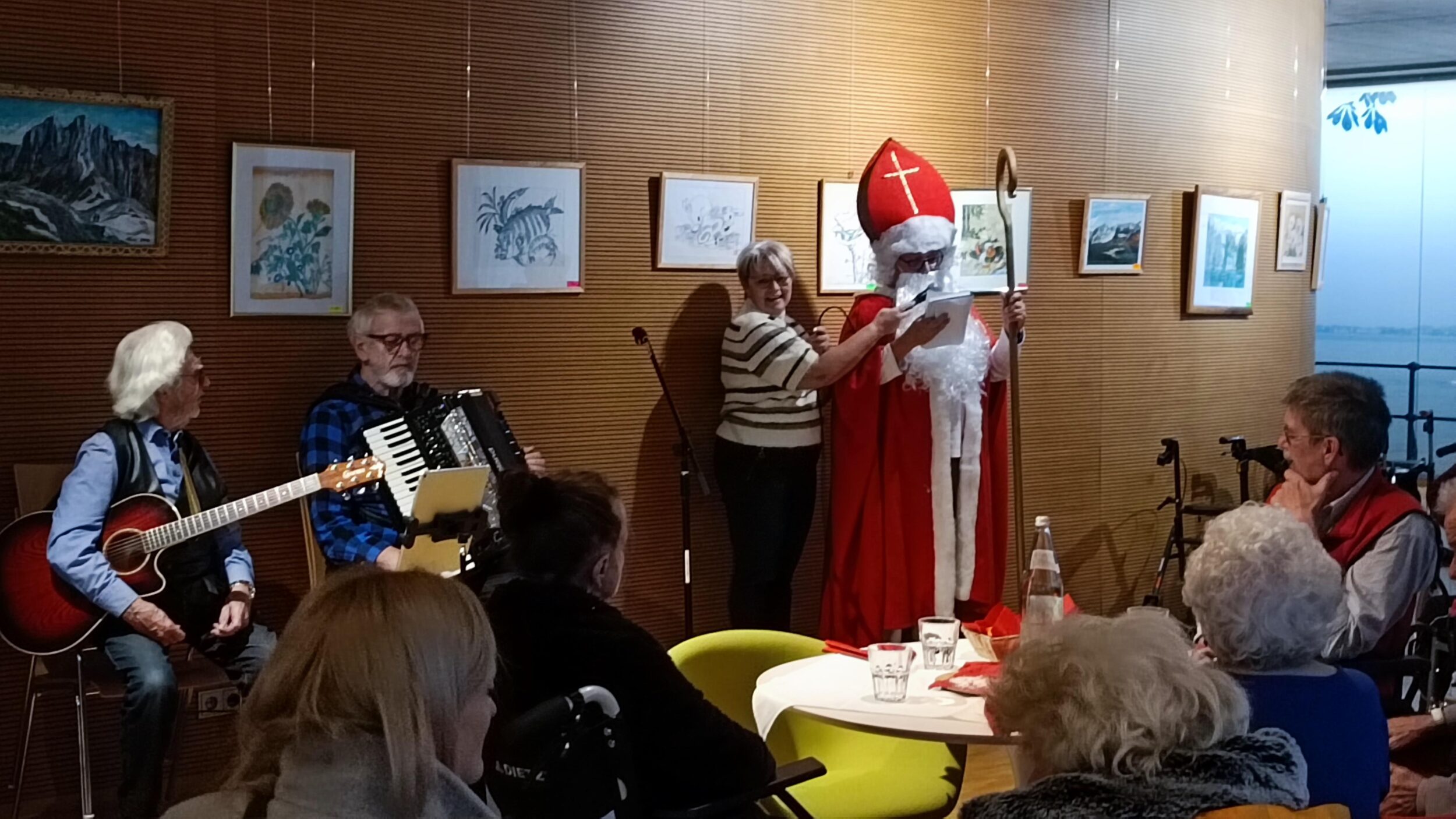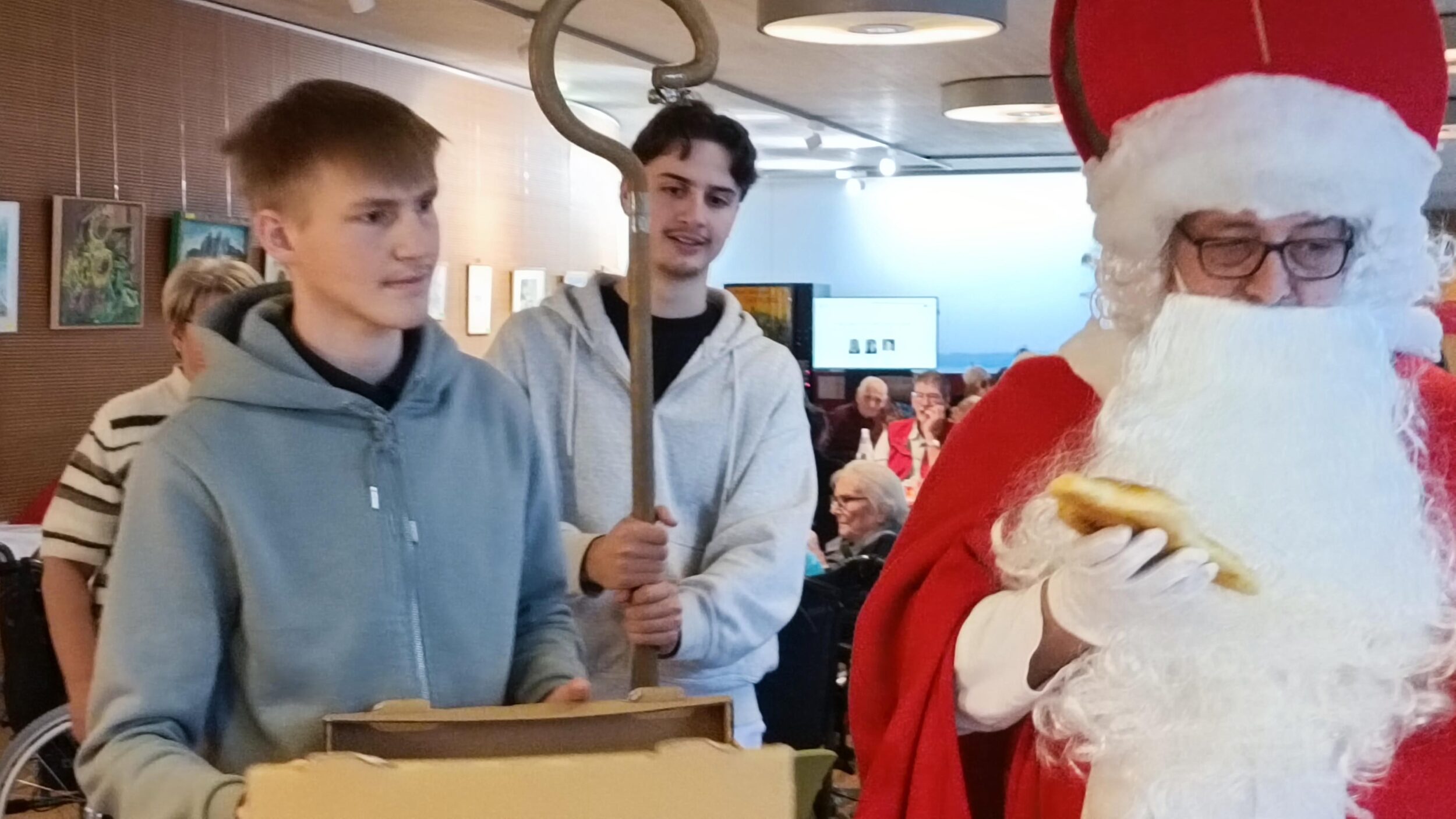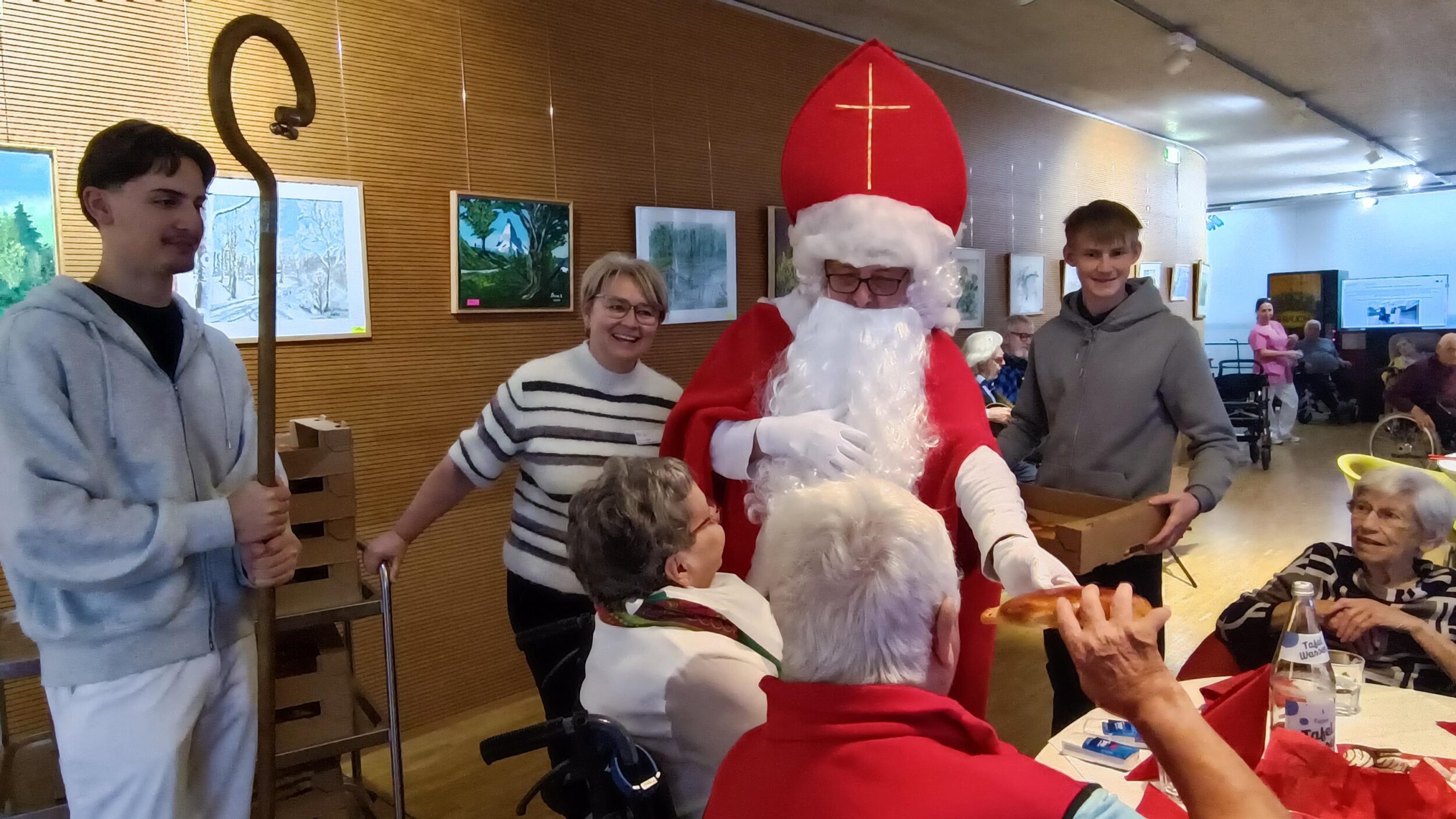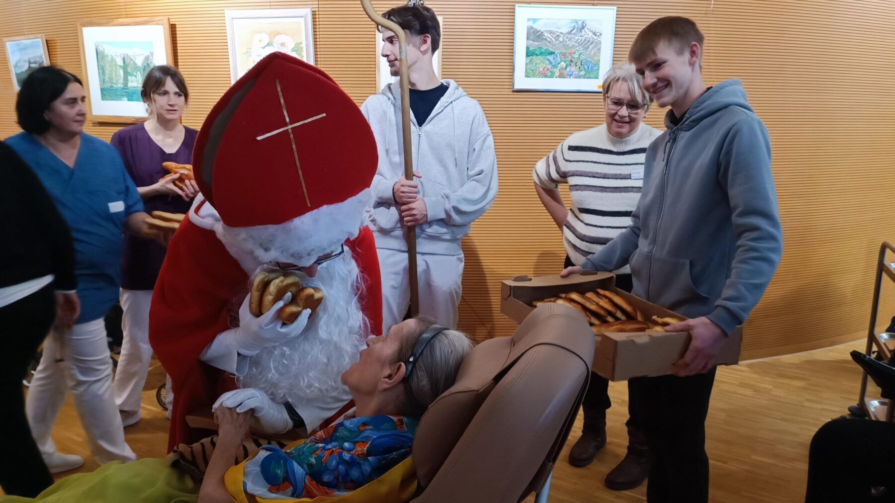Der Nikolaus betritt das liebevoll geschmückte Pflegeheim, sein Glöckchen klingt leise und beruhigend. Die Bewohnerinnen und Bewohner schauen auf, die Augen leuchten neugierig und warm. Eine kurze, ruhige Geschichte entfaltet sich im Raum und trägt eine sanfte, märchenhafte Atmosphäre. Im Duft von Zimt und Nelken mischen sich leise Lächeln, erinnernde Blicke und zustimmendes Nicken.