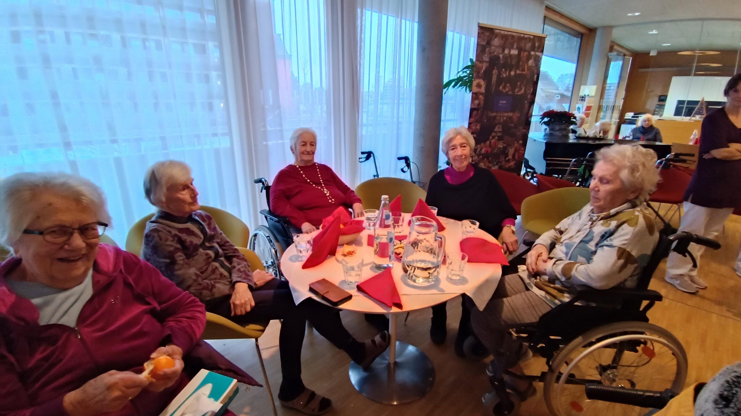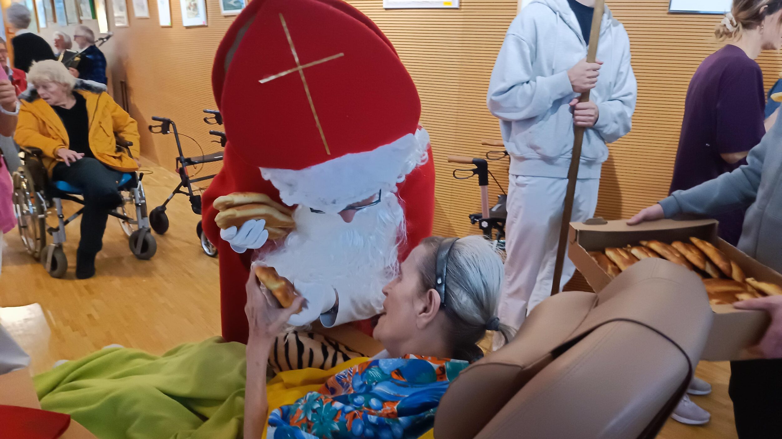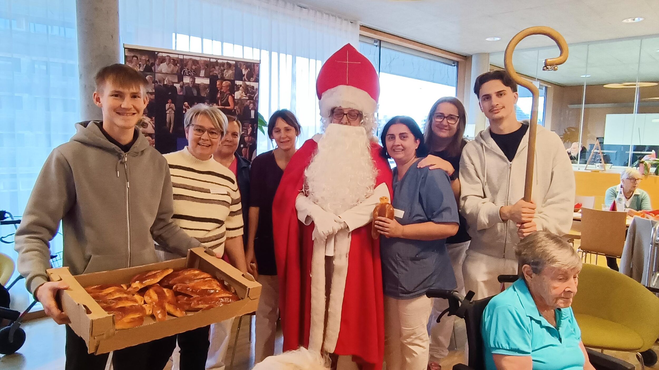 Der Nikolaus betritt das liebevoll geschmückte Pflegeheim, sein Glöckchen klingt leise und beruhigend. Die Bewohnerinnen und Bewohner schauen auf, die Augen leuchten neugierig und warm. Eine kurze, ruhige Geschichte entfaltet sich im Raum und trägt eine sanfte, märchenhafte Atmosphäre. Im Duft von Zimt und Nelken mischen sich leise Lächeln, erinnernde Blicke und zustimmendes Nicken.