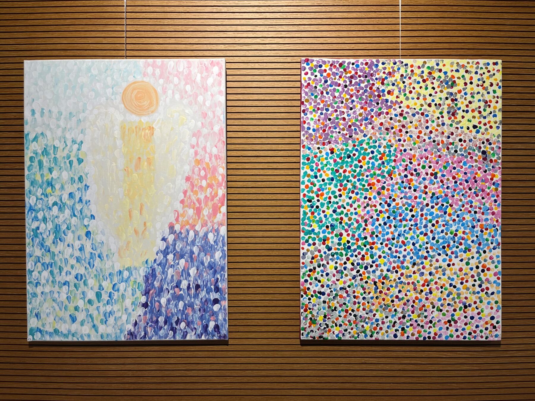 Ihre besondere Art des Zeichnens zeichnet sich dadurch aus, dass sie ausschließlich mit den Fingern arbeitet. So entstehen kleine Punkte und lebendige Muster direkt auf die Leinwand – eine einzigartige und berührende Technik.