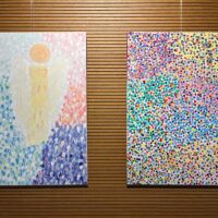 Ihre besondere Art des Zeichnens zeichnet sich dadurch aus, dass sie ausschließlich mit den Fingern arbeitet. So entstehen kleine Punkte und lebendige Muster direkt auf die Leinwand – eine einzigartige und berührende Technik.