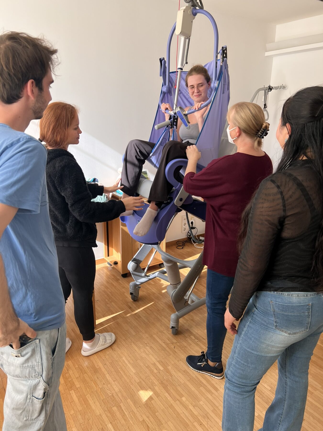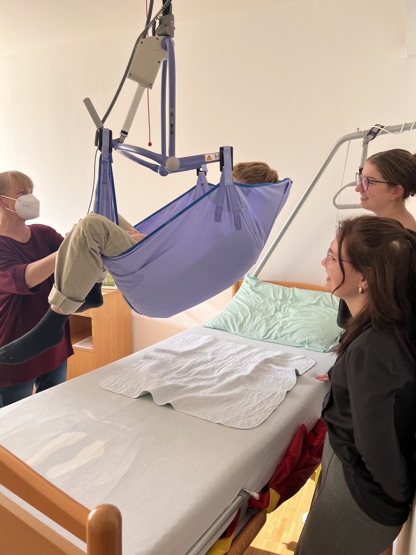 Nach einer kurzen Vorstellung von BENEVIT und dem Sozialzentrum Weidach führten Katja, Patrik, Susanna und Ursula durch das Programm. Der theoretische Teil widmete sich der Bedeutung ergonomischer Transfer- und Hygieneversorgung als Bestandteil des betrieblichen Gesundheitsmanagements – ein Thema, das nicht nur die Bewohner:innen, sondern auch die Gesundheit der Mitarbeitenden betrifft.